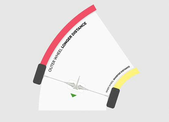 While taking the right turn,axle itself shifts towards left on the tracks.Then,the right side inner wheel rotates on a lesser wheel radius whereas the outer left wheels rotate on larger wheel radius.(in fig.)